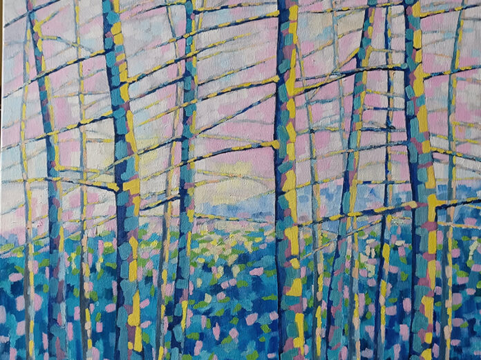 Il tessuto spontaneo della resa paesaggistica è animato da propulsioni protese verso l’alto, lunghi tronchi di alberi che riempiono la campitura del quadro sottolineando, come una firma, il mondo interiore dell’artista.