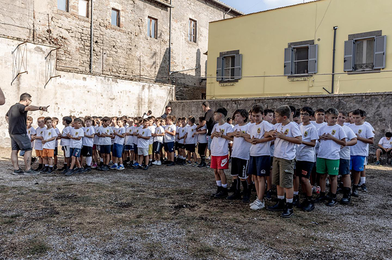 Nello spiazzo dietro la chiesa della Crocetta, in via Mazzini, a Viterbo, il caldo di fine agosto è ancora intenso. Le decine di piccoli piedi calzati negli stivaletti neri alzano nuvolette di polvere, mentre battono all’unisono al ritmo di marcia. Sono giornate importanti: mentre i loro genitori affollano i bordi del campo, i minifacchini fanno le prove per il trasporto della Minimacchina del Centro Storico, in programma per lunedì primo settembre, alle ore 21.