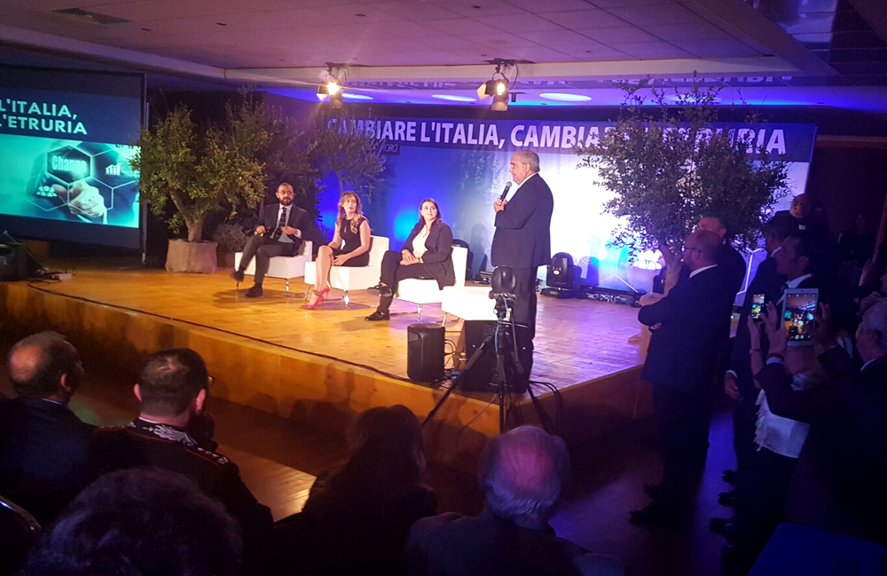 Alle Terme Salus di Viterbo come negli States. Si parla di distretto turistico dell’Etruria Merdionale, di riforma istituzionale, di terrorismo. Nell’ampia sala dell’hotel mancano soltanto i palloncini e le majorettes per emulare le convention americane.