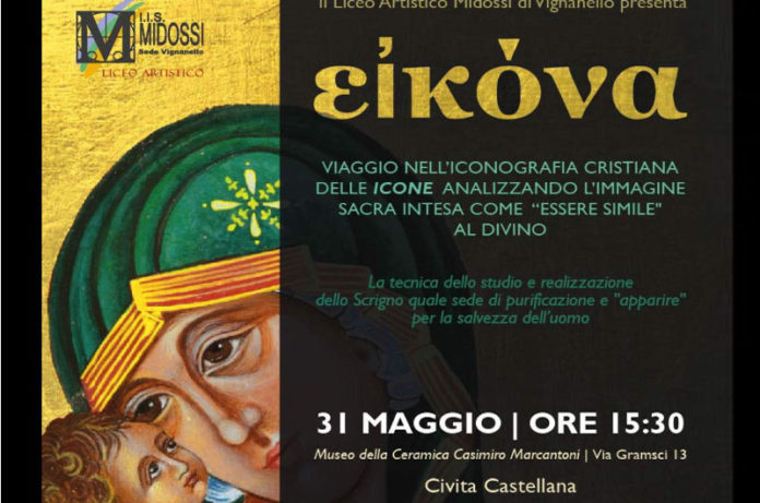 In occasione del progetto, sostenuto dal Dirigente Scolastico Prof. Franco Chericoni, “Tecniche e materiali per la realizzazione delle Icone Sacre nell’arte”, venerdì 31 maggio alle ore 15,30 presso il Museo della Ceramica Casimiro Marcantoni di Civita Castellana in via Gramsci 13, si terrà l’inaugurazione della Mostra “εἰκόνα”, organizzata dagli studenti della classe 2^ A del Liceo Artistico MIDOSSI di Vignanello.