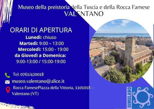 Il Museo resterà aperto al pubblico per tutta l’estate il martedì dalle 9 alle 13, il mercoledì dalle 15 alle 19 e dal giovedì alla domenica dalle 9 alle 13 e dalle 15 alle 19. Chiuso il lunedì. Per effettuare le visite è gradita la prenotazione contattando telefonicamente il numero 0761.420018, inviando una mail all’indirizzo museo.valentano@alice.it oppure alle pagine social Facebook ed Instagram.