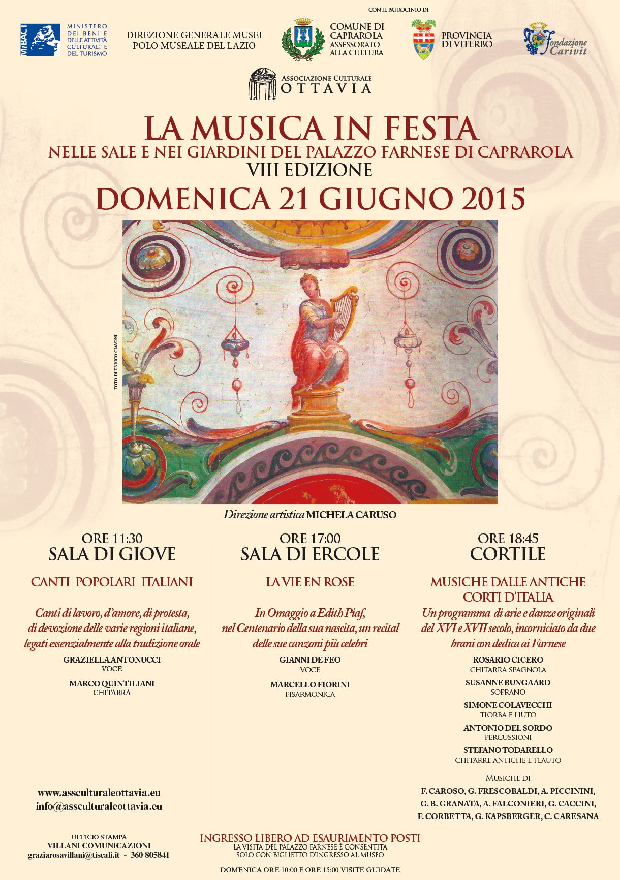 Alle 11.30 la Sala di Giove sarà riempita dalle melodie dei Canti popolari italiani, canti di lavoro, d’amore, di protesta, di devozione delle varie regioni italiane, legati essenzialmente alla tradizione orale con la voce di Graziella Antonucci e la chitarra di Marco Quintiliani.
