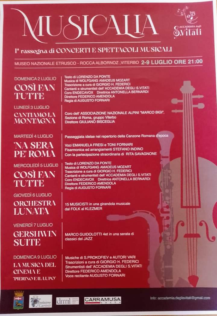 Da un’idea del maestro Federico Amendola, prende vita Musicalia, rassegna musicale presentata martedì 20 giugno da Alfonso Antoniozzi  vice sindaco e assessore alla Cultura e all’Educazione del Comune di Viterbo,  da Sara De Angelis, direttrice del Museo nazionale etrusco Rocca Albornoz, dove dal 2 al al luglio, alle ore 21.00, si susseguiranno sette concerti di elevato spessore. Presente anche il regista Augusto Fornari.Una settimana di eventi che riporterà la musica e gli spettacoli nel museo.”Sarà musica, ma con tanto altro” ha spiegato Federico Amendola, direttore musicale della rassegna.Presente anche la grande atttrice-doppiatrice Rita Savagnone che tra l’altro vive a Viterbo, prenderà parte  alla serata di martedì 4 luglio con “’Na sera pe Roma”. Un’idea nuova di vivere il museo attraverso generi diversi che il pubblico viterbese saprà apprezzare. Si partirà domenica 2 luglio con “Così fa tutte”di Mozart e Da Ponte, con cantanti e strumentisti dell’accademia degli S. Svitati e regia di Augusto Fornari.