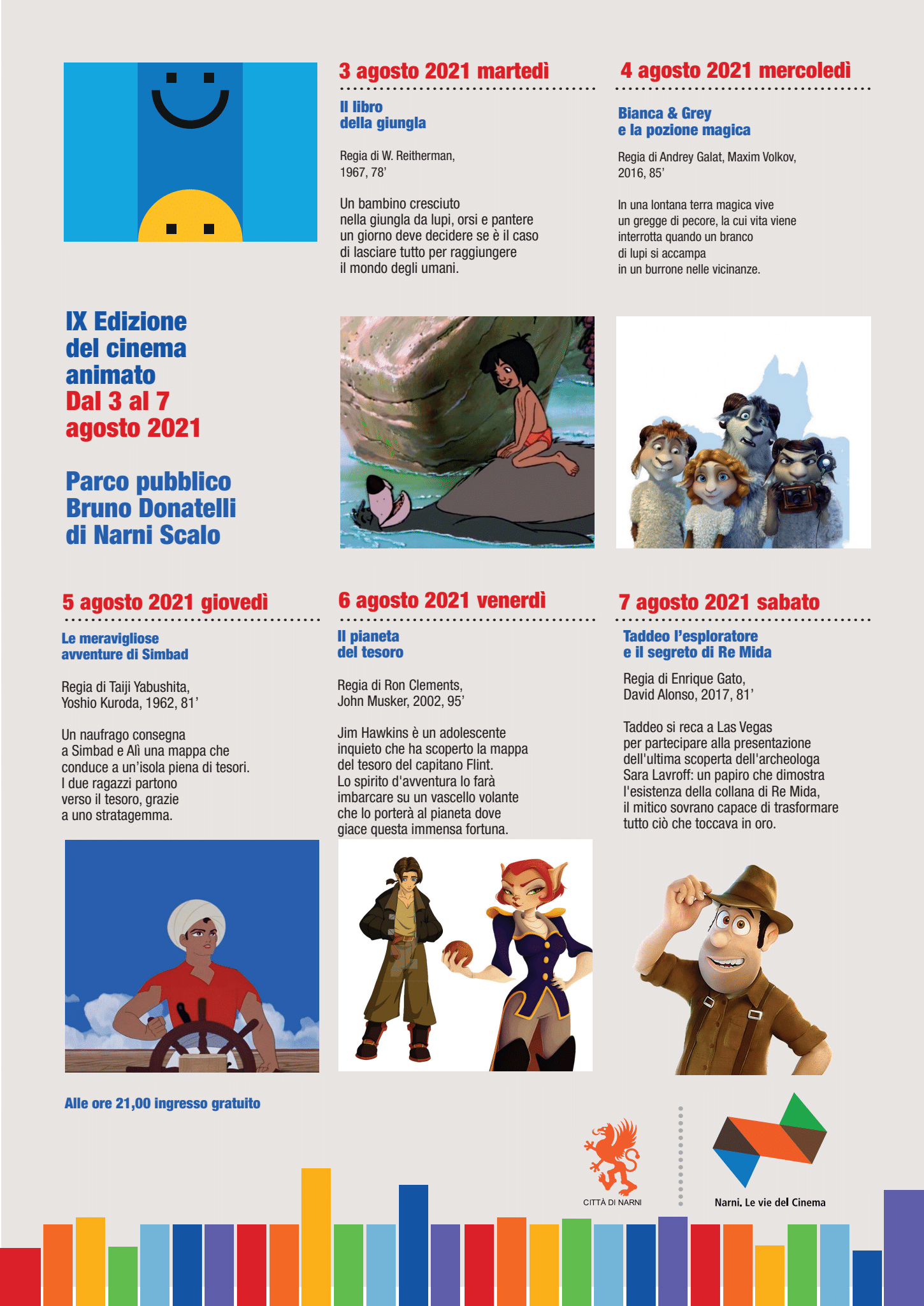 TORNA PER I PIÙ PICCOLI LA RASSEGNA DEL CINEMA ANIMATO. La rassegna parallela alla classica selezione di pellicole restaurate proporrà ogni sera su grande schermo a partire dalle ore 21.00, in un’ala laterale del Parco pubblico “Donatelli”, una selezione di film animati dedicati ai più piccini. Saranno proposti: Il libro della giungla di Wolfgang Reitherman, Bianca e Grey e la pozione magica di Andrey Galat, Maxim Volkov, Le meravigliose avventure di Simbad di Taiji Yabushita, Yoshio Kuroda, Il pianeta del tesoro Ron Clements, John Musker, Taddeo l’esploratore e il segreto di re Mida di Enrique Gato e David Alonso.