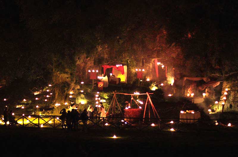 Un teatro naturale per un evento che vuole ricreare la vita quotidiana della Palestina di allora, un viaggio indietro nel tempo fra le ambientazioni di 2000 anni fa. Lungo tutto il percorso si potranno ammirare donne, uomini e bambini intenti a svolgere i lavori e i giochi dell’epoca, un accampamento di soldati romani e ovviamente la stalla dove è nato Gesù. Il tutto accompagnato da una musica di sottofondo che renderà l’ambientazione ancora più magica.