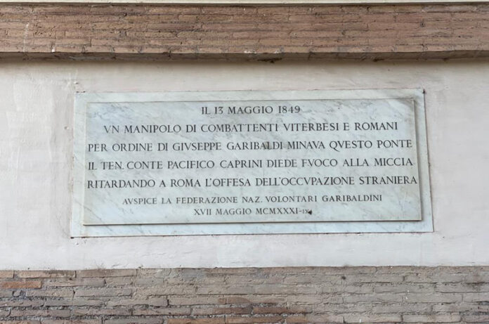 IL 13 MAGGIO 1849 UN MANIPOLO DI COMBATTENTI VITERBESI E ROMANI PER ORDINE DI GIUSEPPE GARIBALDI MINAVA QUESTO PONTE IL TEN. CONTE PACIFICO CAPRINI DIEDE FUOCO ALLA MICCIA RITARDANDO A ROMA L’OFFESA DELL’OCCUPAZIONE  STRANIERA – AUSPICE LA FEDERAZIONE NAZ. VOLONTARI GARIBALDINI XVII MAGGIO MCMXXXI“.