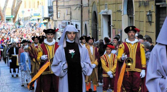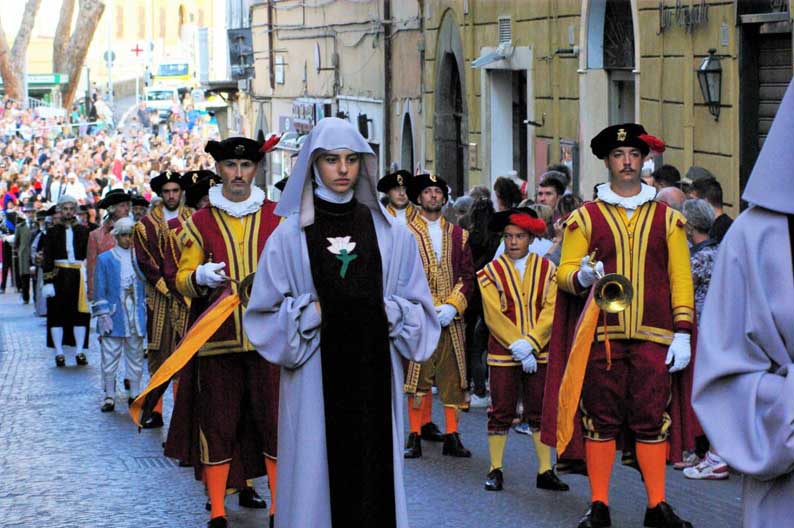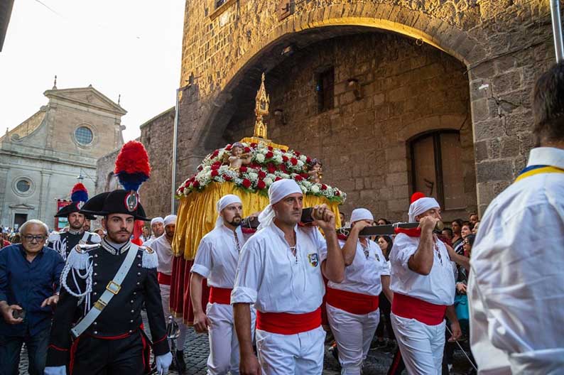 Il 2 settembre di ogni anno il Corteo Storico di Santa Rosa sfila per le vie di Viterbo ed accompagna, in una prestigiosa cerimonia che evidenzia l’aspetto più intimo e religioso dei festeggiamenti, la Solenne Processione con il Cuore di santa Rosa. Quest’anno la pandemia non permette di rinnovare l’antica usanza per la quale le autorità cittadine insieme al clero si recavano, a rendere omaggio alla Patrona, come deliberato nel 1512 dal Consiglio dei Quaranta, «…con voto e giuramento solenne per celebrare, ogni anno in perpetuo, la sua festa per i santi benefici che il Sommo Dio, per intercessione della Santa, ha concesso e concede alla Città. Nel corso della processione viene condotto, lungo le principali vie cittadine, il Cuore di Santa Rosa. Il Corteo parte dal Santuario di Santa Rosa e attraversa il quartiere medievale fino alla Cattedrale; da qui ha inizio la processione attraverso le vie del centro che si conclude con il rientro alla chiesa della Santa. Il Corteo Storico è composto da circa 310 figuranti con costumi tipici dei vari secoli, a partire dal 1200 fino ad arrivare al 1800, che rappresentano le massime autorità viterbesi, con le rispettive milizie, che hanno celebrato nel tempo la loro amata piccola concittadina. Aprono il Corteo i Boccioli simbolo del particolare legame dei piccoli viterbesi di oggi con la loro Santa. Separano i vari secoli le Rosine, ragazze che indossano un saio grigio violaceo raffiguranti la giovane figura Quest’anno il cuore della santa sarà venerato in monastero nella sala dove è in corso la Mostra Storico-Documentaria: “Testimoni di Fede in Terra della Tuscia”.L’ingresso in santuario e negli altri spazi è consentito ad una persona alla volta, rispettando la distanza di 1,5 metri.È obbligatorio l’uso della mascherina.Si può partecipare liberamente non servono prenotazioni o biglietti,quest’ultimo (gratuito) è indispensabile solo per la messa solenne delle 10.30 del 4 settembre celebrata dal vescovo.Una festa introspettiva vissuta dentro di noi, in cui tutto si muove per “renderne presente l’assenza”