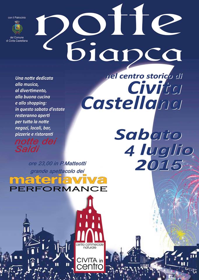 Artisti di strada, musica, buona cucina e shopping: tutto questo è la Notte Bianca di Civita Castellana in programma sabato 4 luglio dalle 19 alle 4 presso il centro storico di Civita Castellana. La manifestazione, giunta quest’anno alla terza edizione è organizzata dal CCN – Centro Commerciale Naturale di Civita Castellana.