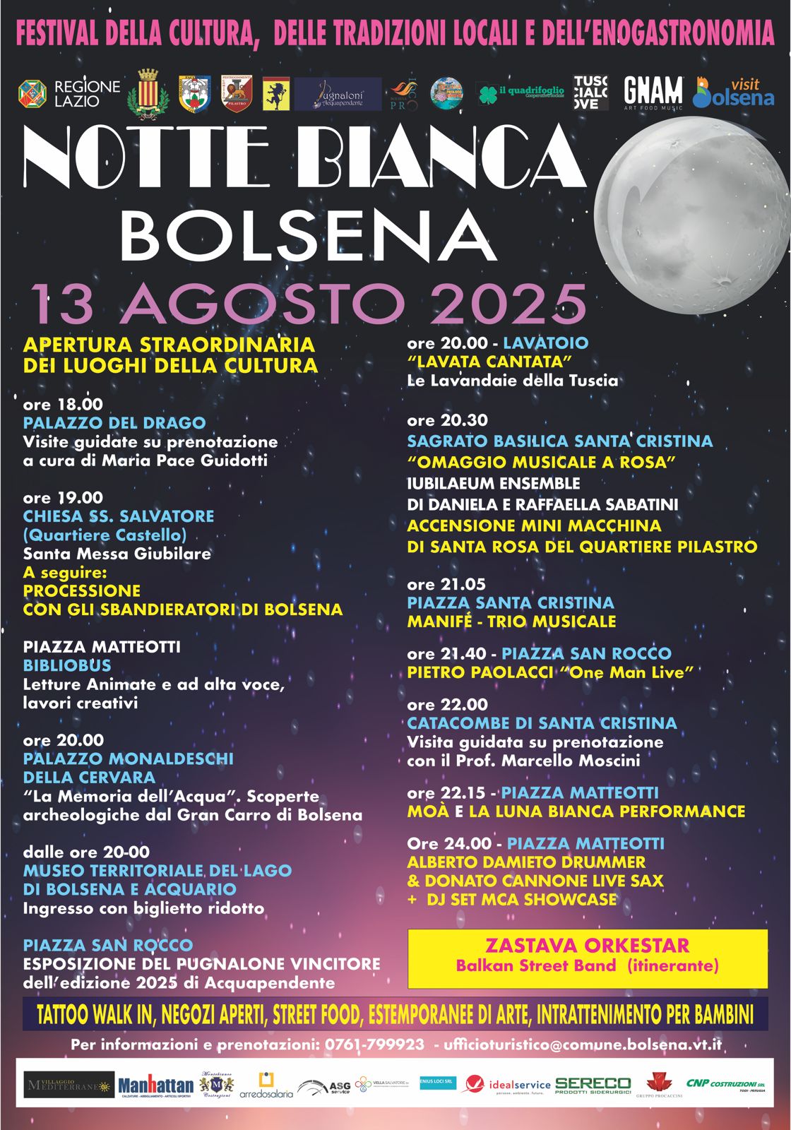 In occasione del Giubileo, la Notte Bianca renderà anche un omaggio al patrimonio spirituale del territorio. L’apertura della serata sarà scandita da una suggestiva processione, con la partecipazione del corteo storico di Bolsena, dei Pugnaloni di Acquapendente, dei mini facchini di Santa Rosa e degli sbandieratori di Bolsena.