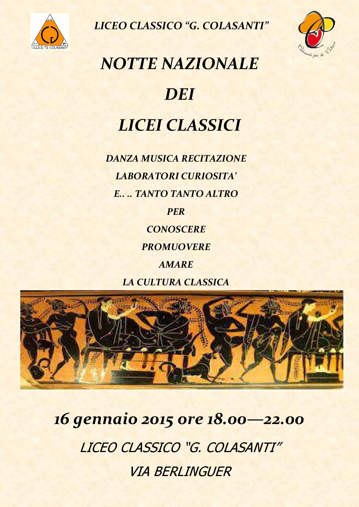 Anche il Liceo Classico “G. Colasanti” di Civita Castellana aderisce alla Notte Nazionale dei Licei Classici. L’evento è fissato per il 16 gennaio 2015 dalle 18 alle 22 durante il quale l’Istituto aprirà le porte e si farà promotore di una serie di eventi culturali.
