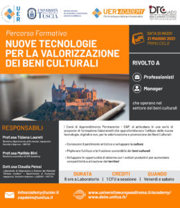 Il Dipartimento DEIM (di Economia e Impresa) dell’Università degli Studi della Tuscia e l’UER Academy dell’Università degli Studi Europea con il contributo del Distretto Tecnologico Beni e Attività Culturali (DTC) del Lazio hanno lanciato un innovativo programma di apprendimento permanente di livello universitario sulle nuove tecnologie per la valorizzazione dei beni culturali. Il programma prevede corsi brevi della durata di 8 ore e del costo di 400 euro ciascuno, fruibili in diretta streaming e on demand, che possono essere seguiti indipendentemente l’uno dalla altro, così da costruire un percorso formativo personalizzato. Ci saranno 2 cicli, il primo inizia il 21 maggio prossimo. Chiunque si può iscrivere, non ci sono restrizioni. I temi trattati, da docenti universitari ed esperti riconosciuti nei diversi settori, riguardano l’applicazione delle nuove tecnologie digitali e non, alla progettazione di interventi per la valorizzazione dei beni culturali, la tutela e la fruizione sostenibile, la comunicazione e la promozione, le partnership sul territorio. In particolare: realtà aumentata e tecnologie visuali interattive, big data e social media mining, intelligenza artificiale applicata ai beni culturali, comunicazione multicanale, biotecnologie microbiche per biorestauro, diagnostica innovativa, olografia interattiva, didattica interattiva, progettazione di interventi per la valorizzazione dei beni culturali, la tutela e la fruizione sostenibile, la comunicazione e la promozione, le partnership sul territorio. Al link: http://www.unitus.it/it/dipartimento/deim/corsi-di-apprendimento-permanente-/articolo/corsi-di-apprendimento-permanente ci sono tutte le schede dei laboratori con i nomi dei docenti.