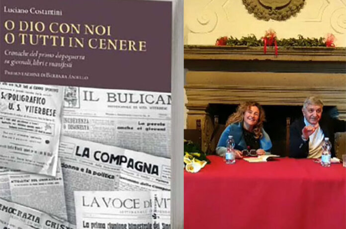 Una sala gremita venerdi pomeriggio, quella di Palazzo Gallo, gestita dall’associazione Amici di Bagnaia, in tanti hanno partecipato alla presentazione del terzo libro del giornalista e scrittore Luciano Costantini “O Dio con noi o tutti in cenere” con cui l’autore ha voluto riportare una piccola testimonianza del sistema mediatico del tempo. Cioè come giornali, libri, manifesti hanno raccontato la difficile e pur vitalissima realtà di quegli anni. Ha introdotto la presentazione Rossella Orsini Quadrani, ribadendo la inclinazione all’accoglienza dell’associazione Amici di Bagnaia e la tutela di quell’ambiente ritornato in cura alla stessa associazione, in cui vengono messe in luce le peculiarità del borgo, le tradizioni, la cultura che sprigionano dalterritorio viterbese. Al tavolo di presentazione, a moderare, la bravissima storica dell’arte Barbara Aniello che ha saputo condurre i partecipanti con quel fil rouge ideale a catturare l’attenzione del pubblico presente, evidenziando del libro gli elementi stimolanti di quel periodo storico, occorre «fare un esempio»: la forza dell’esempio può servire a rappresentare un concetto, e, se non può esaurire la spiegazione, tuttavia può fornire un’idea, alimentare una riflessione. Ed è così che dai giornali rilevati da Costantini si fissano fotografie dell’epoca,il Teatro Unione in grande tiro di eventi, il Gran Caffè Schenardi pensatoio d’eccellenza e luogo d’incontro prestigioso, cinema e teatri scomparsi nell’attuale contesto storico, riferimenti in certi casi  oggi invisibili, di cui le nuove generazioni non ne conoscono il significato e il pregio artistico. Non un amarcord quello di Costantini, ma una sollecitazione a sviluppare  nelle nuove generazioni una memoria collettiva, non c’è nel libro l’interpretazione giudicante ma semplicemente è viva quella narrante, per non dispendere il valore della traccia del periodo a cui si fa riferimento. Un vedutista ha definito l’autore la moderatrice Aniello, che da storica dell’arte ne conosce l’etimologia pura, nel caso di Costantini colui che preferisce riprodurre oggettivamente la realtà che analizza. Un libro che si legge velocemente e piacevolmente, edito da Sette Città e reperibile presso la libreria Fernandez, in via Mazzini a Viterbo. Qualcuno si è chiesto cosa significasse il titolo, è una frase riportata nel libro, al lettore il piacere di ritrovarla…