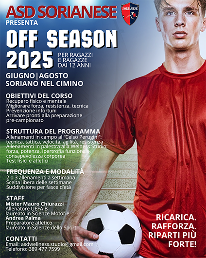 Parte ufficialmente “Off Season 2025”, il programma estivo rivolto a ragazzi e ragazze a partire dai 12 anni che desiderano vivere un’estate di crescita sportiva e personale. L’iniziativa si terrà da giugno ad agosto presso lo stadio “Celso Perugini” di Soriano nel Cimino, con sedute che uniscono preparazione fisica, lavoro tecnico e prevenzione degli infortuni, per arrivare in forma alla nuova stagione.