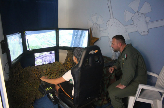 Il camion trasformabile, è dotato di 2 postazioni distinte per i piloti, supervisionate dai militari AVES di Viterbo in divisa mimetica. La partecipazione è stata ottima e ogni singolo turno aveva durata di almeno 5 minuti, nei quali gli istruttori spiegavano a chi era alla guida, le procedure di decollo, virata e atterraggio. Un’esperienza interessante e divertente per i partecipanti a questa guida gratuita, che vuole far anche avvicinare i giovani al mondo militare, anche in modo ludico. I visitatori si sono cimentati in una simulazione di attività volativa corrispondente alle condizioni reali.