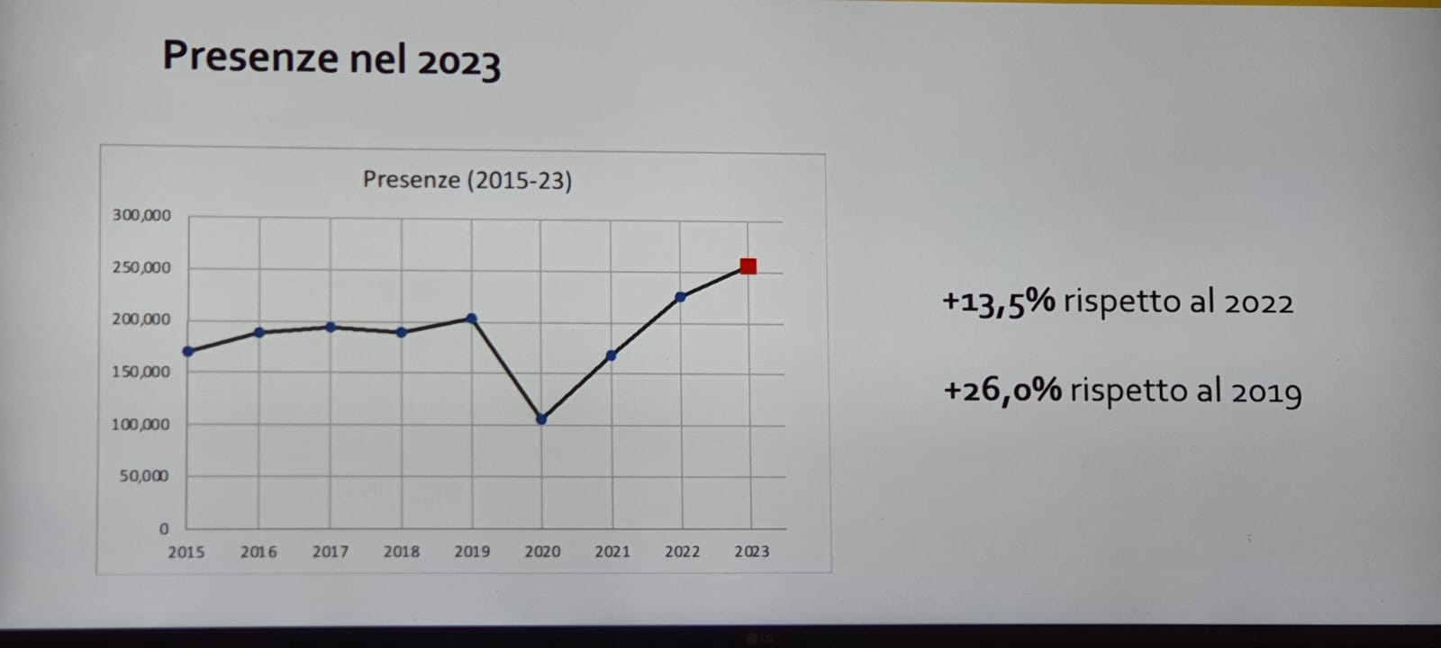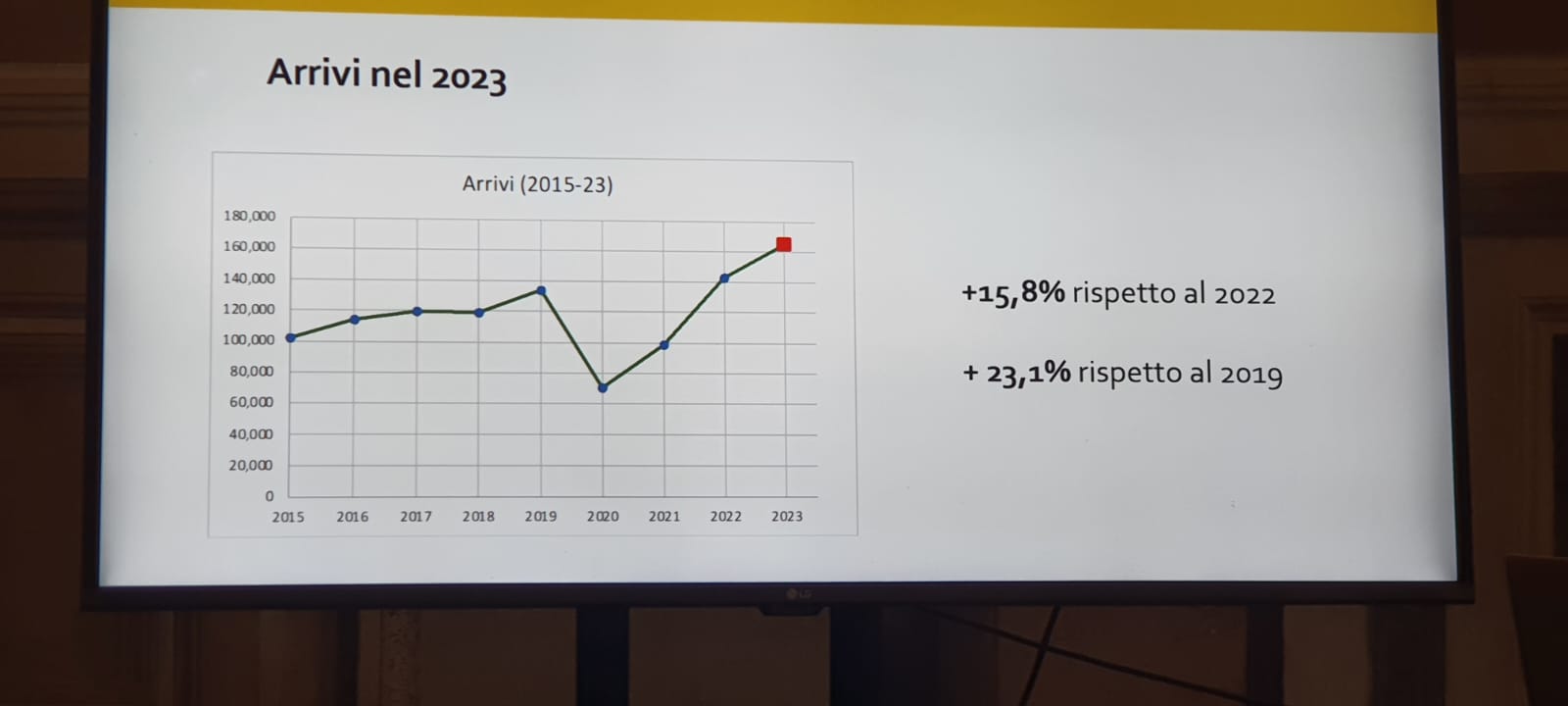 Un boom che fa esplodere Viterbo oltre le duecentocinquantamila presenze nel 2023. Per salutare la performance nella Sala Regia di Palazzo dei Priori viene convocato un incontro congiunto (peraltro già programmato) tra amministratori comunali e operatori del settore turistico. Titolo: “Mai così tanti”. Sicuramente azzeccato, se è vero che i numeri che snocciola l’assessore al ramo, Silvio Franco, sono assolutamente “inattesi”. E vale davvero la pena di metterli in fila. Arrivi 165.000 (+ 15,8% rispetto al 2022 e + 23,1% rispetto al 2019), presenze 256.000 (+ 13,5% e + 26,0%), permanenza media 1,6 notti, incasso della imposta di soggiorno 478.000 euro. “Siamo qui, sottolinea, non a caso, la sindaca Chiara Frontini, per illustrare lo stato dell’arte, fotografare il trend e continuare insieme a raccogliere delle riflessioni”. “Il numero di oltre 250.000 presenze – aggiunge l’assessore Franco – ci permette adesso di passare da città che ospita turisti a vera e propria città turistica, anche perché questa cifra è legata al pernottamento e quindi non siamo dinanzi a semplici arrivi”. A dare l’idea del boom sono anche altri numeri, tutti con il segno positivo. Le 256.000 presenze sono state così ripartite: 147.911 negli alberghi, 15.308 nei bed and breakfast, 11.867 nelle affittacamere, 9.584 nelle case per ferie, 35.046 nelle locazioni turistiche, 17.781 nelle case per vacanze, 18.567 negli agriturismi. A proposito di boom c’è da registrare quello delle locazioni turistiche con un + 143,0% dal 2019 al 2023. Tirano anche le case per vacanze (+ 72,3%) e quelle per ferie (+ 69,2%). In arretramento gli alberghi (-9,8%) i bed and breakfast (- 1,5%). In totale, sono 427 le strutture che Viterbo può mettere oggi a disposizione dei turisti, prime tra tutte le locazioni turistiche (213). A seguire, le case per vacanze (72), i bed and breakfast (64), gli agriturismi (30), le affittacamere (27), gli alberghi (18), e le case per ferie (3). “Certamente siamo contenti dei risultati, francamente insperati, quasi sbalorditivi – afferma con orgoglio l’assessore Franco –. Risultati che attribuisco al trend generale del turismo, comunque doppio rispetto al dato nazionale; all’aumento dell’offerta del territorio; alle politiche di questa amministrazione. Ma vogliamo fare di più”. L’idea, l’obiettivo finale, è quello che in qualche viene palesemente indicato nella brochure distribuita alla stampa: “Matera nel 2014, anno della proclamazione a Capitale Europea della Cultura, registrava un numero di presenze (245.000) inferiore a quello attuale di Viterbo. Nel 2019, in cui è stata Capitale Europea della Cultura, ha raggiunto le 730.000 presenze”. Chissà la magia dei numeri…