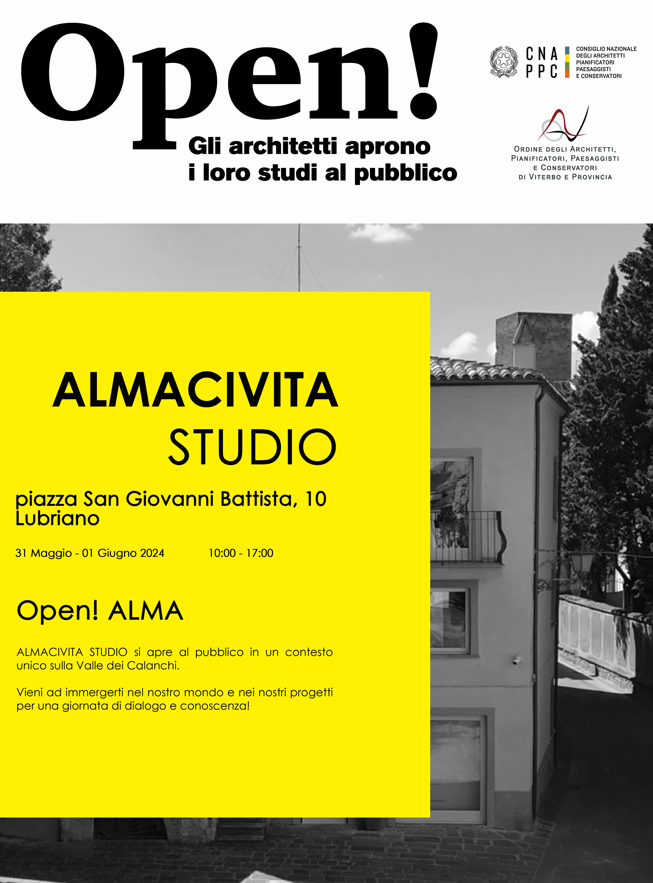 Venerdì 31 maggio e sabato 1 giugno prossimi ritorna “Open! Studi Aperti”, l’evento nazionale organizzato dal CNAPPC (Consiglio Nazionale degli Architetti, Pianificatori, Paesaggisti e Conservatori) per promuovere e diffondere la cultura architettonica in tutta Italia. Anche l’Ordine degli Architetti PPC (Pianificatori, Paesaggisti e Conservatori) della provincia di Viterbo aprono i loro studio, uno scorcio paesaggistico sulla Tuscia lo riserva a Lubriano Alma Civita Studio , in piazza san Giovanni Battista ,10 con  uno stupendo scenario del paesaggio dei Calanchi dalle 10.00 alle 17.00 in entrambi i giorni.Ad accogliere gli architetti: