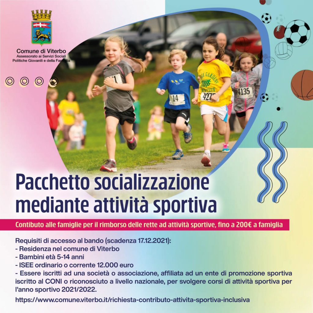 Pacchetto socializzazione mediante attività sportiva inclusiva, online da giovedì 2 dicembre l’avviso pubblico. Le domande dovranno pervenire entro il prossimo 17 dicembre con le modalità riportate nello stesso avviso pubblico. Si tratta di una misura rivolta a famiglie residenti a Viterbo, con figli di età compresa tra i 5 e i 14 anni compiuti nel 2021, iscritti a una società o associazione, affiliata a un ente di promozione sportiva iscritto al CONI o riconosciuto a livello nazionale, per svolgere corsi di attività sportiva per l’anno sportivo 2021/2022. Tra i requisiti indispensabili l’ISEE non superiore a 12mila euro. Il contributo, riferito a ogni singolo ragazzo, è di un importo di € 100,00, con un limite massimo di € 200,00 a famiglia. “Una misura importante – sottolinea il sindaco Giovanni Maria Arena -. Un’iniziativa intersettoriale che abbiamo riproposto, dopo lo stop dello scorso anno. Ringrazio il consigliere comunale delegato ai rapporti con le associazioni e le società sportive Matteo Achilli per aver promosso questa iniziativa, frutto di una proficua collaborazione istituzionale tra l’assessore ai servizi sociali Sberna e l’assessore allo sport De Carolis”. “Un avviso che consente di fornire un sostegno economico alle famiglie in difficoltà – ha spiegato l’assessore ai servizi sociali Antonella Sberna – . Ritengo sia il modo ideale per incentivare la pratica dello sport dopo le difficoltà dei mesi scorsi, soprattutto quelli del lockdown che hanno imposto lo stop forzato alle attività sportive anche di bambini e adolescenti. Un’iniziativa che va a sostenere economicamente le famiglie e al tempo stesso contribuisce alla prevenzione del disagio giovanile. Una misura che rientra non solo nell’ambito dei servizi sociali, attraverso il contributo ai nuclei familiari per il pagamento delle rette per l’attività sportiva dei ragazzi, ma riguarda anche le politiche giovanili, in quanto incentivo all’attività sportiva, e quindi alla socializzazione dei nostri giovani”. “Teniamo molto a questa misura proposta dall’assessorato ai servizi sociali – ha continuato l’assessore De Carolis – e siamo felici sia stata riproposta. Un aiuto per tante famiglie che proprio grazie a questo contributo potranno consentire ai loro ragazzi di praticare sport, un’attività sana che fa bene al fisico e alla mente dei nostri figli”. “Una misura che ho promosso insieme ai servizi sociali anche a seguito della sollecitazione da parte di famiglie, associazioni e società sportive – ha aggiunto il consigliere delegato Achilli -. Un connubio perfetto tra sport, salute, prevenzione, socializzazione e sostegno economico, elementi indispensabili per promuovere politiche attive per bambini e adolescenti della nostra città”. La versione integrale dell’avviso (con allegato modello di domanda) è consultabile sul sito istituzionale www.comune.viterbo.it alla sezione settori e uffici – settore V – avvisi pubblici oppure direttamente al link https://www.comune.viterbo.it/richiesta-contributo-attivita-sportiva-inclusiva/.