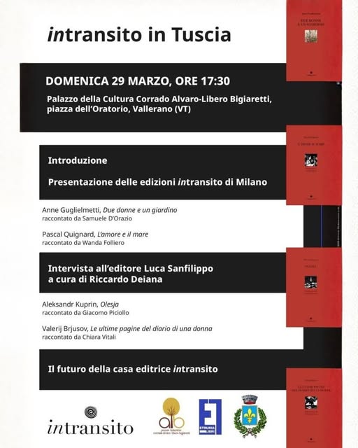 Domenica 29 marzo, alle ore 17.30, presso il Palazzo della Cultura Corrado Alvaro – Libero Bigiaretti di Vallerano, si terrà un incontro dedicato alla casa editrice “intransito” di Milano.