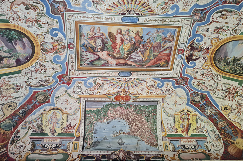 Salendo per un elegante scalone si raggiunge il loggiato, le cui volte presentano raffinate grottesche affrescate verso il 1570-1580 e integrate con altri soggetti nel decennio successivo all’acquisizione dei Giustiniani. Le sale sono tutte decorate da pregiati affreschi opera di artisti di grande fama come il Domenichino, Bernardo Castello, Paolo Guidotti.