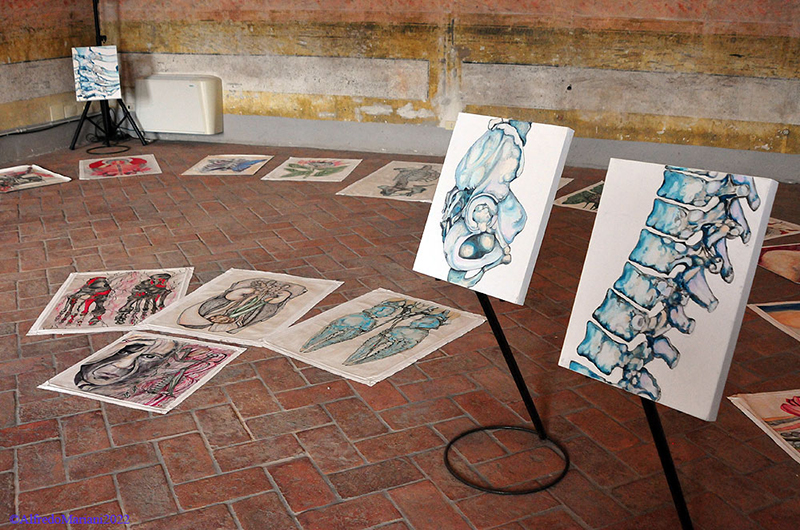 Nella seconda sala sono esposti i dipinti su tela dall’artista ucraina Irina Budarina. Pittrice, fondatrice di una scuola d’arte per bambini, ma anche stilista e imprenditrice di successo nel settore della moda, tutto quanto è riuscita a creare è oggi dissolto nel nulla a causa dell’aggressione russa alla sua nazione. Le sue tele sono presentate con un allestimento davvero particolare: sono prive del telaio in legno e poggiate in terra, pur sullo splendido pavimento in cotto cinquecentesco, proprio a simboleggiare e ricordare la drammatica situazione che sta vivendo l’Ucraina e tutti i suoi cittadini. Irina è riuscita a staccare le tele dai loro telai, arrotolarle e infilarle in una borsa, insieme con poche altre cose, nella fuga con la sua famiglia. Sono tutto quello che rimane della sua attività. Ed ha deciso che torneranno sui telai solo quando tornerà la pace nel suo Paese. Si tratta di opere intense, dove lo studio dell’anatomia umana si intreccia con la ricerca di cromatismi floreali, creando opere assolutamente originali.