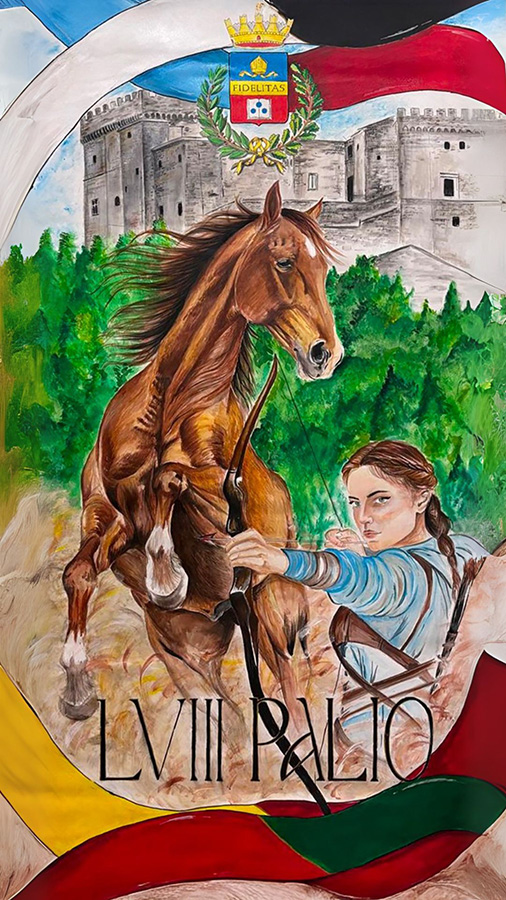“Nell’opera intitolata La sfida ho rappresentato Soriano nel Cimino con il suo stemma, dietro sullo sfondo, per avere la sua importanza. Al centro la figura del cavallo, simbolo sia del gioco degli anelli, che con la sua forza rappresenta in pieno la vera sfida. Un arciere impegnato nel lancio della freccia il tutto unito dalla natura come sfondo. Ho poi deciso di mettere le quattro contrade ad incorniciare tutta la tela, come se racchiudessero tutta l’energia della festa.”