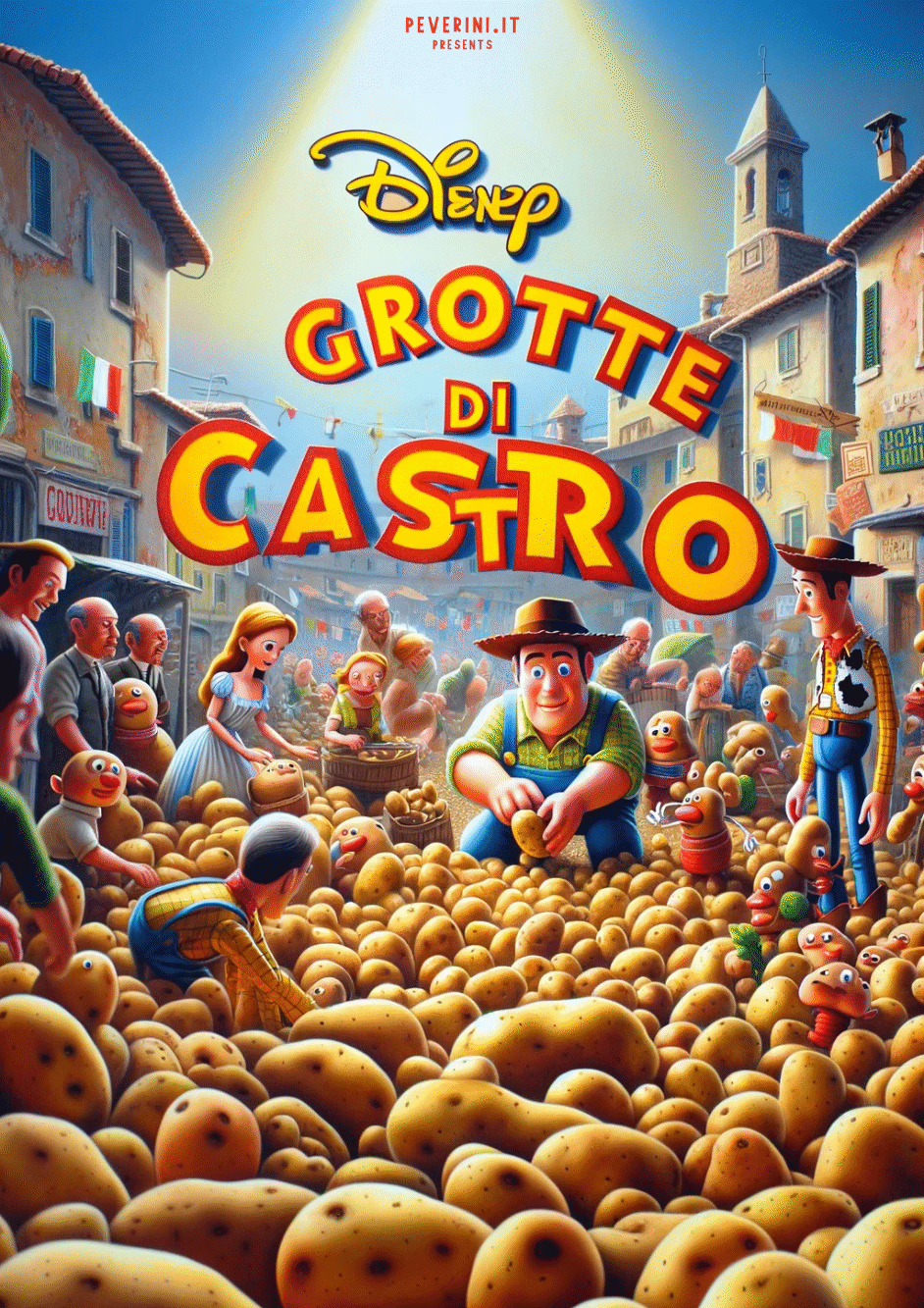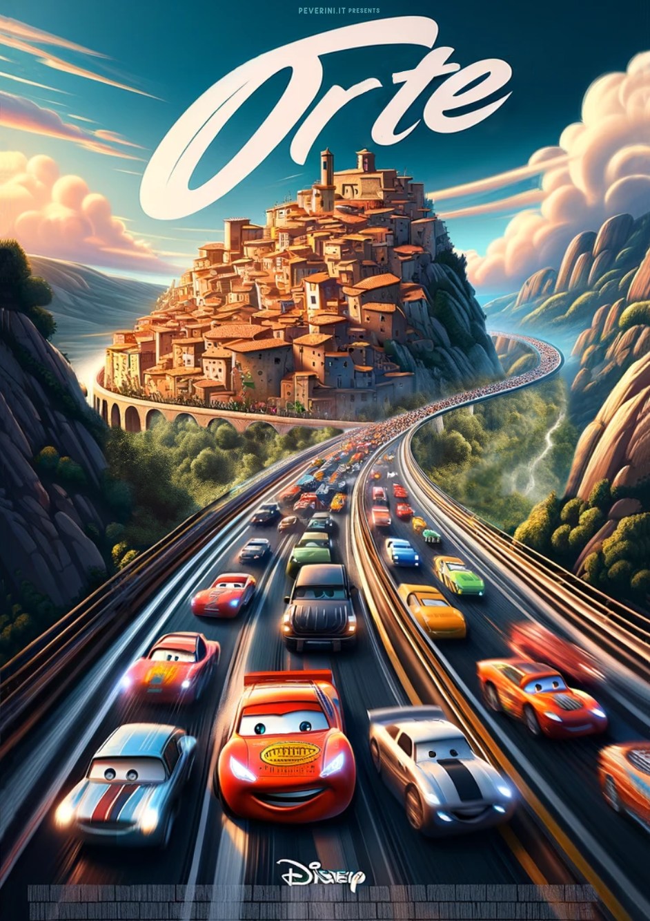 Una laurea in marketing, comunicazione e pubblicità, un diploma in pittura all’Accademia di Belle Arti, fin da bambino Peverini ha portato avanti un duplice percorso artistico: da un lato le tecniche pittoriche manuali, dall’altro le possibilità offerte dalla grafica digitale. «Mio padre fu uno dei primi in Italia a comprare un Macintosh. Avevo tre, quattro anni, e disegnavo già le prime casettine sul computer». Anche se oggi la sua professione assorbe gran parte del suo tempo, Paolo non dimentica la sua dimensione artistica. «Quella di combinare tecniche digitali e manuali è una forma d’arte che in pochi usano ed è il mio modo di esprimermi. In passato ho fatto mostre individuali e collettive. Sono un autodidatta curioso: continuo a studiare, a sperimentare sempre nuove possibilità. Ora è la volta dell’intelligenza artificiale: nel mio lavoro è molto utile, mi aiuta a fare tantissime cose». E’ questo lo strumento che gli ha consentito di creare le buffe locandine cartoon. «Questo progetto è servito per mettere in evidenza i tanti borghi della nostra Tuscia, e allo stesso tempo per mettere alla prova le mie capacità nell’utilizzo dell’intelligenza artificiale. In tanti adesso la temono, perché pensano che sia tanto perfetta da sostituire qualsiasi azione umana. In realtà non è così, perché l’IA ha sempre bisogno di una persona che la istruisca in modo adeguato. Per esempio, non riesce ancora a creare decentemente una mano, o anche una semplice scritta, e bisogna intervenire e correggere. Anche qui: digitale e manuale vanno in parallelo, non è qualcosa in cui ci si può improvvisare. Per fare le locandine di alcuni paesi ho dovuto fare una cinquantina di prove, perché il risultato non era mai esattamente quello che avevo in mente, e magari ho dovuto sovrapporre due o tre immagini insieme». Le locandine cartoon sono uscite in due volte, perché per realizzare le prime Peverini ha impiegato un mese e mezzo. «Sono affezionato a tutte: tra le più azzeccate, secondo me, c’è quella di Piansano – declinata al futuristico Toy Story, per la questione delle pale eoliche; Onano con la Torre Eiffel, perché è detta “la piccola Parigi”… Anche Orte, che avendo l’autostrada vicina è stata abbinata a Cars. Qualche paese lo conosco di più, perché sta nella zona dove risiedo, l’Alta Tuscia; altri non li conoscevo assolutamente, e c’è stato un grande studio dietro per riuscire a cogliere, per ciascuno, il tratto distintivo. Le locandine sono piaciute tantissimo, ho ricevuto complimenti, ci sono state chiamate di sindaci che mi hanno invitato in paese… Ma ci sono state critiche in egual misura! Qualcuno avrebbe voluto altri soggetti, altri si sono addirittura offesi. Per quale motivo, poi? In fondo si tratta soltanto di satira». Tra gli entusiasti, vi sono stati gli abitanti delle frazioni. «Da Bagnaia mi hanno sommerso di richieste! Ma ci sono stati anche inviti di “sconfinamento” da parte di città come Orvieto, Civitavecchia».