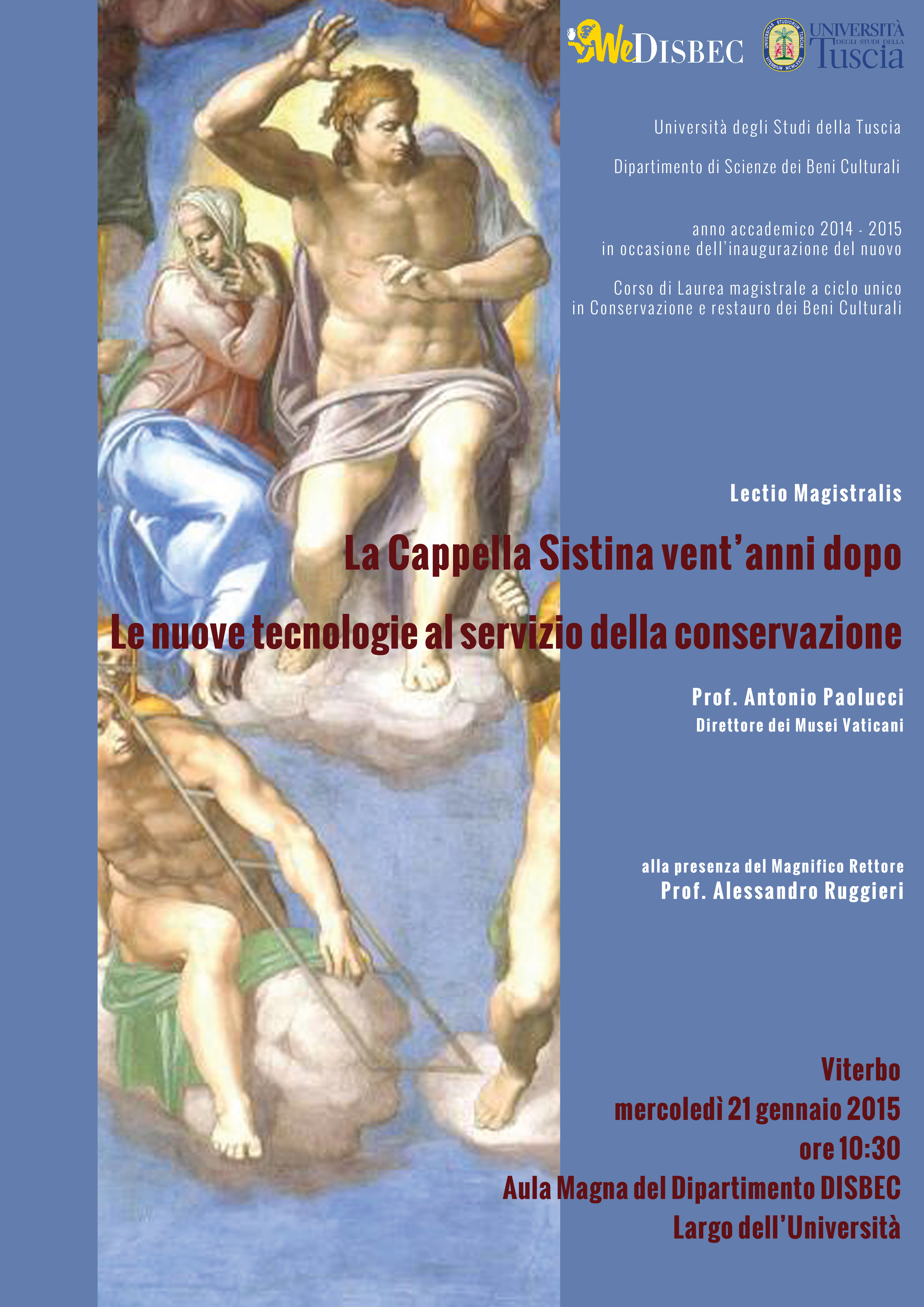 Lectio Magistralis del professor Antonio Paolucci  direttore dei Musei Vaticani: “La Cappella Sistina vent’anni dopo. Le nuove tecnologie al servizio della conservazione”. L’appuntamento è per mercoledì 21 gennaio alle ore 10,30 all’Aula magna del Dipartimento DISBEC (Beni Cultiurali). Saranno presenti il prof. Alessandro Ruggieri, rettore dell’Università della Tuscia, il Direttore generale avv. Alessandra Moscatelli, la professoressa Gabriella Ciampi direttore del DISBEC, esperti, docenti e studenti. La Lectio Magistralis del prof. Antonio Paolucci coincide con l’inaugurazione del nuovo corso di laurea magistrale a ciclo unico in Conservazione e Restauro dei Beni Culturali.