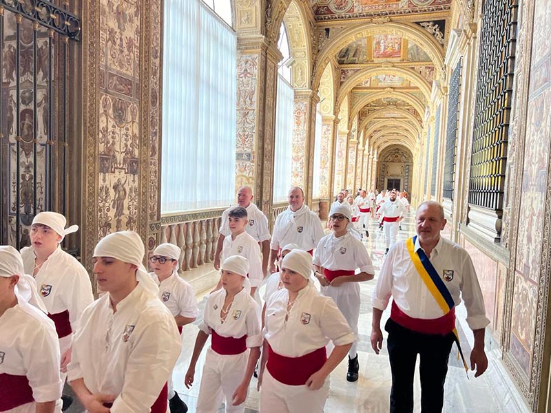 Il Sodalizio dei Facchini di Santa Rosa ha donato a papa  Francesco un ciuffo – il tipico cuscinetto in cuoio dei Facchini che occupano le posizioni sottostanti la base della Macchina – dipinto dal maestro Michele Telari, mentre il costruttore di Gloria – l’ultima Macchina di Santa Rosa realizzata – Vincenzo Fiorillo e l’ideatore Raffaele Ascenzi hanno offerto un bozzetto dell’opera dell’altezza di 1 metro e 20 centimetri, mentre da parte del Monastero di Santa Rosa la madre superiora suor Francesca Pizzaia ha consegnato un modellino in legno realizzato nell’ambito del progetto “Incastri per ricostruire”, frutto del lavoro svolto da un gruppo di persone detenute impegnate nelle attività di formazione che il Centro Studi Santa Rosa da Viterbo e l’Università degli Studi della Tuscia hanno avviato a partire dal 2020 in collaborazione con la Casa Circondariale di Viterbo e il Sodalizio Facchini di Santa Rosa.