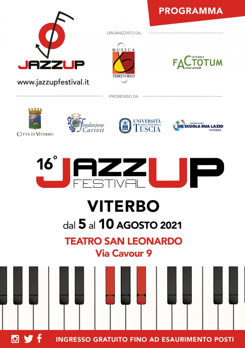 Il programma della sedicesima edizione di JazzUp Festival, che si svolgerà a Viterbo presso il Teatro San Leonardo(Via Cavour 9) dal 5 al 10 Agosto 2021.