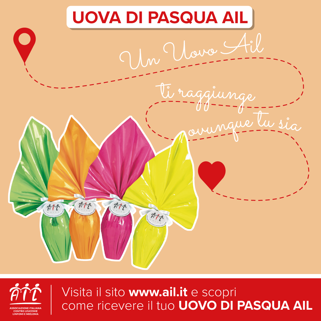 Acquistare un uovo di Pasqua dell’AIL. Dal 1969 AIL promuove e sostiene la ricerca scientifica per la cura delle leucemie, dei linfomi e del mieloma. Assolve il compito di assistere i malati e le loro famiglie, lotta al loro fianco per migliorarne la qualità della vita e sostenerli nel complesso percorso delle cure. Sensibilizza l’opinione pubblica sulla lotta contro le malattie del sangue.