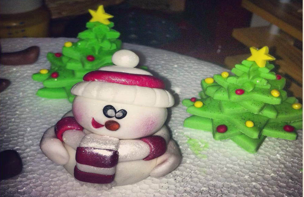 Decorazione di un piccolo panettone con pupazzetti fatti con la pasta di zucchero e dei biscottini da appendere all’albero.