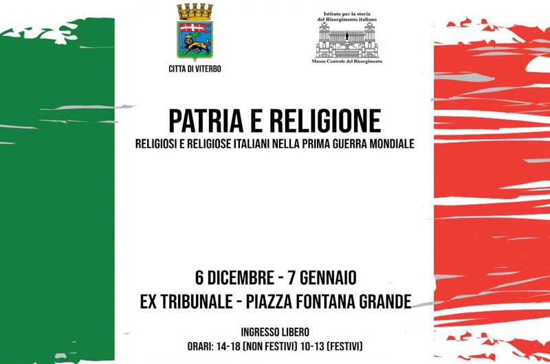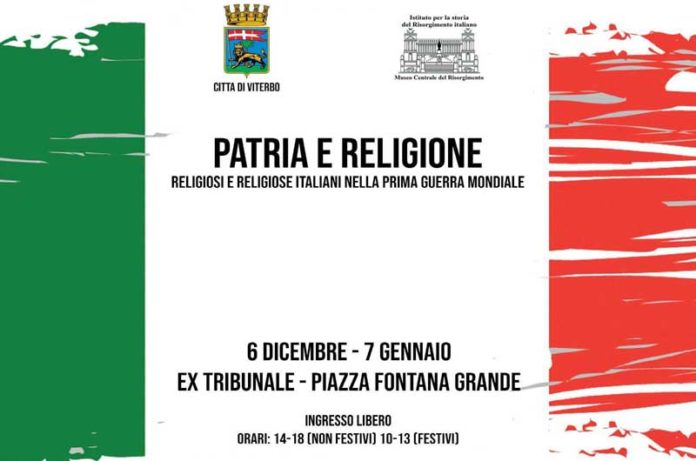 Venerdì 6 dicembre alle ore 11,30 sarà inaugurata la mostra Patria e Religione – Religiosi e Religiose nella prima guerra mondiale 1915-1918. L’evento è promosso dal Comune di Viterbo – Assessorato alla cultura, in collaborazione con l’Istituto per la storia del Risorgimento italiano – Museo centrale del Risorgimento. La mostra è allestita negli spazi dell’ex tribunale in piazza Fontana Grande. Sarà aperta al pubblico fino al prossimo 7 gennaio, con il seguente orario: dalle ore 14 alle ore 18, nei giorni non festivi, e dalle ore 10 alle ore 13 nei festivi, compresi 25, 26 dicembre, 1 e 6 gennaio). L’ingresso è libero. Alla cerimonia di inaugurazione interverranno il sindaco Giovanni Maria Arena e l’assessore alla cultura Marco De Carolis.
