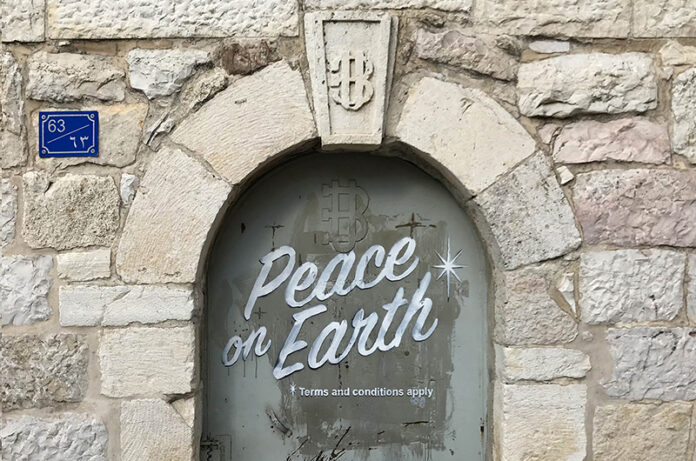 Si intitola Peace on Earth – prendendo spunto dal graffito realizzato da Banksy a Betlemme, su un muro nei pressi della Grotta del Latte – ed elabora il tema attraverso i colori e le metafore graffianti di questo grande artista internazionale. Tale scritta iconica contiene una postilla: “Terms and conditions apply”. Su questo si sviluppa poi il progetto, quale vera indagine sul valore della pace nell’arte di Banksy. Il simbolo? Una colomba con il giubbotto antiproiettile e un ramoscello d’ulivo tra il becco, che lotta proprio per portare la pace.