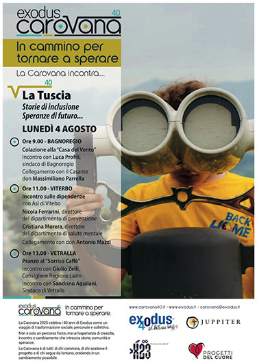 celebrare i 40 anni di attività della realtà fondata da don Antonio Mazzi, arriverà nella provincia di Viterbo dal 31 luglio al 5 agosto, con una serie di incontri ed esperienze di comunità lungo la Via Francigena, accolti dai ragazzi di Juppiter e dal presidente Salvatore Regoli.