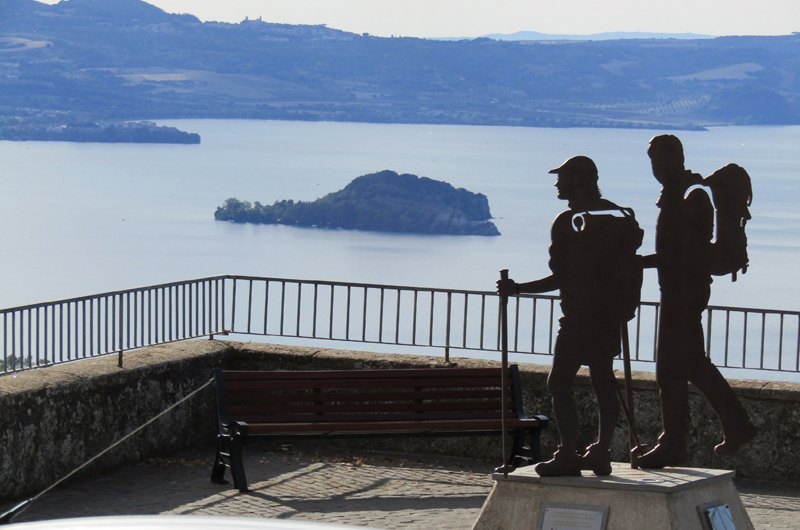 Partenza dalla Rocca dei Papi a Montefiascone, un luogo dove si ritrovavano i pellegrini prima di affrontare la tratta della Francigena. Nonostante sia stata danneggiata nel corso del tempo, è incredibile ancora la sua maestosità e ci fa rendere l’idea dell’importanza storica che ebbe in passato. La sua storia è legata alle vicende di vari pontefici quando le invasioni da parte dei normanni e saraceni erano frequenti e molti dei pontefici furono costretti alla fuga da Roma. Si vennero così a creare le condizioni per realizzare la fortezza, con alte mura difensive, all’interno delle quali si riversarono anche gli abitanti delle campagne.