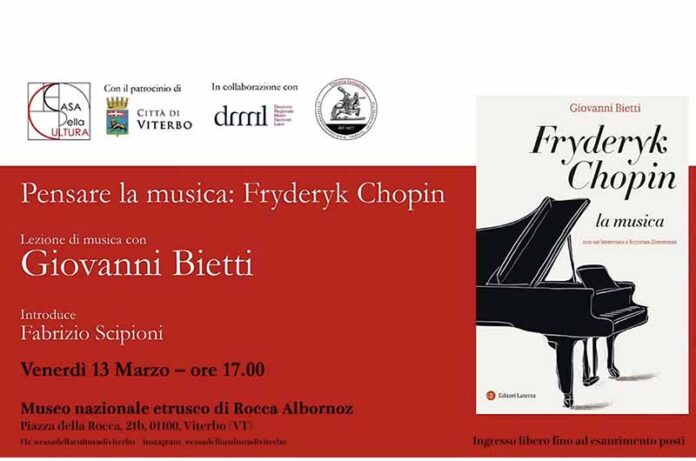 Venerdì 13 marzo alle ore 17:00  presso i locali del mezzanino del Museo nazionale etrusco di Rocca Albornoz di Viterbo è previsto l’incontro: “Pensare la musica: Fryderyk Chopin – Incontro con Giovanni Bietti” in occasione della presentazione del suo ultimo volume dedicato al grande compositore polacco. L’evento, organizzato dalla “Casa della Cultura” di Viterbo grazie al patrocinio del Comune di Viterbo e della Direzione musei nazionali Lazio.Introduce Fabrizio Scipioni