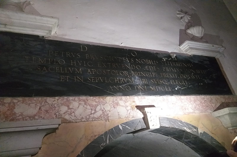 La ricognizione ha confermato che esiste una cappella che ospiterebbe la tomba – non ci sono certezze – del famoso pittore viterbese Giovanni Francesco Romanelli (1610-1662). Altre cappelle, nel corso dei decenni, sono state murate e comunque modificate per allestire celle, sale di attesa per i detenuti e la grande “gabbia” a sinistra del tavolo dei giudici. Accertata anche l’ubicazione della tomba della famiglia Brugiotti che come altre casate viterbesi, Casini, Pettirossi, Signorini contribuirono alla manutenzione del tempio. A sinistra in fondo, una grata che protegge una botola sotto la quale si apre una cripta di una ventina di metri quadrati che custodiva verosimilmente le spoglie di importanti personaggi e che risultano parzialmente violate. Ma, mistero dei misteri, sul pavimento opposto sono emerse, dalla polvere e dai calcinacci, le lastre sepolcrali di almeno due botole ermeticamente chiuse e su una delle quali figura l’effige di un teschio. Come dire che lì sotto vi sono altre tombe, almeno una. Se non addirittura un corridoio che magari conduca alla cripta. Un mistero tutto da svelare o, più semplicemente, un percorso sotterraneo da esplorare. Che va accertato prima che partano i lavori di trasformazione del sito.