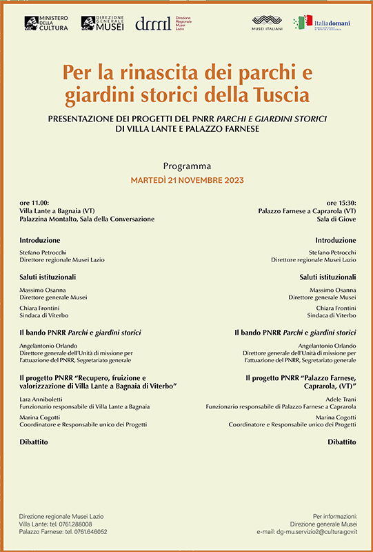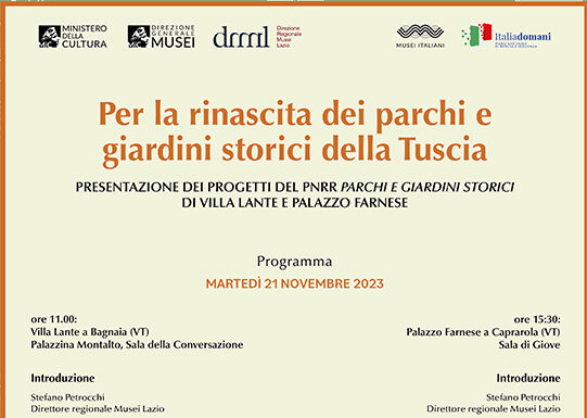 Per la rinascita dei parchi e giardini storici della Tuscia, presentazione dei progetti del Pnnr su Villa Lante-Bagnaia e Palazzo Farnese Caprarola, se ne parlerà in un incontro previsto il giorno 21 novembre alle ore 11,00 a Villa Lante di Bagnaia, presso la palazzina Montalto-Sala della Conversazione. Introduce i lavori il dr. Stefano Petrocchi direttore dei Musei del Lazio, interverrà Massimo Osanna direttore generale Musei, interverrà anche la sindaca di Viterbo Chiara Frontini. Il restante programma per la parte pomeridiana avrà seguito a Palazzo Farnese a Caprarola nella meravigliosa sala di Giove. S’inizierà alle 15.30. A chiusura è previsto il dibattito.