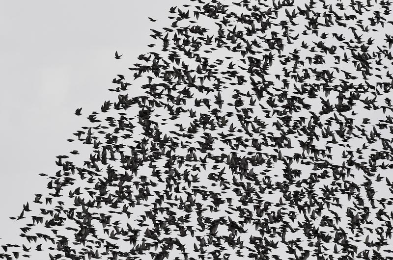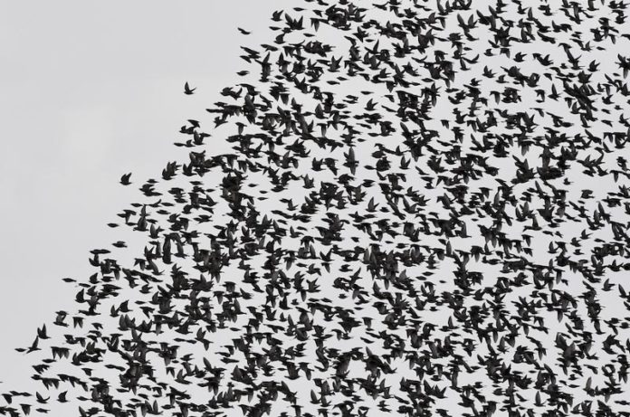Alzando gli occhi al cielo in questo periodo dell’anno, di mattina e di sera, può capitare di vedere un gran numero di piccoli uccelli volare in gruppo, disegnando complesse scenografie aeree: sono gli storni, o Sturnus vulgaris secondo la denominazione scientifica, piccoli uccelli migratori di cui esistono tra i 200 e 100 milioni di esemplari nel mondo, in Italia sono stati stimati tra uno e quattro milioni. Se nelle città del nord Italia tendenzialmente passano per migrare più a sud, mentre in altre località del centro come Viterbo e del sud vivono per tutto l’anno. D’inverno comunque ce ne sono di più, perché la popolazione residente viene raggiunta da stormi che provengono dall’Europa settentrionale e orientale, ma si presume che in generale il loro numero in Italia stia aumentando. In generale non è una specie molto affezionata ai luoghi in cui si trova a fare il nido e a migrare: sia le variazioni climatiche che la disponibilità delle risorse alimentari spingono gli storni a cambiare le proprie abitudini. In Italia i primi storni migratori arrivano a metà agosto, ma il grosso della migrazione, a cui partecipano decine di milioni di uccelli, avviene dalla fine di settembre all’inizio di novembre. Questo periodo comunemente è quello in cui si possono vedere più stormi nelle città del nord Italia, ma vuoi che il cambio climatico abbia disorientato anche loro tanto da creare spostamenti di periodo.