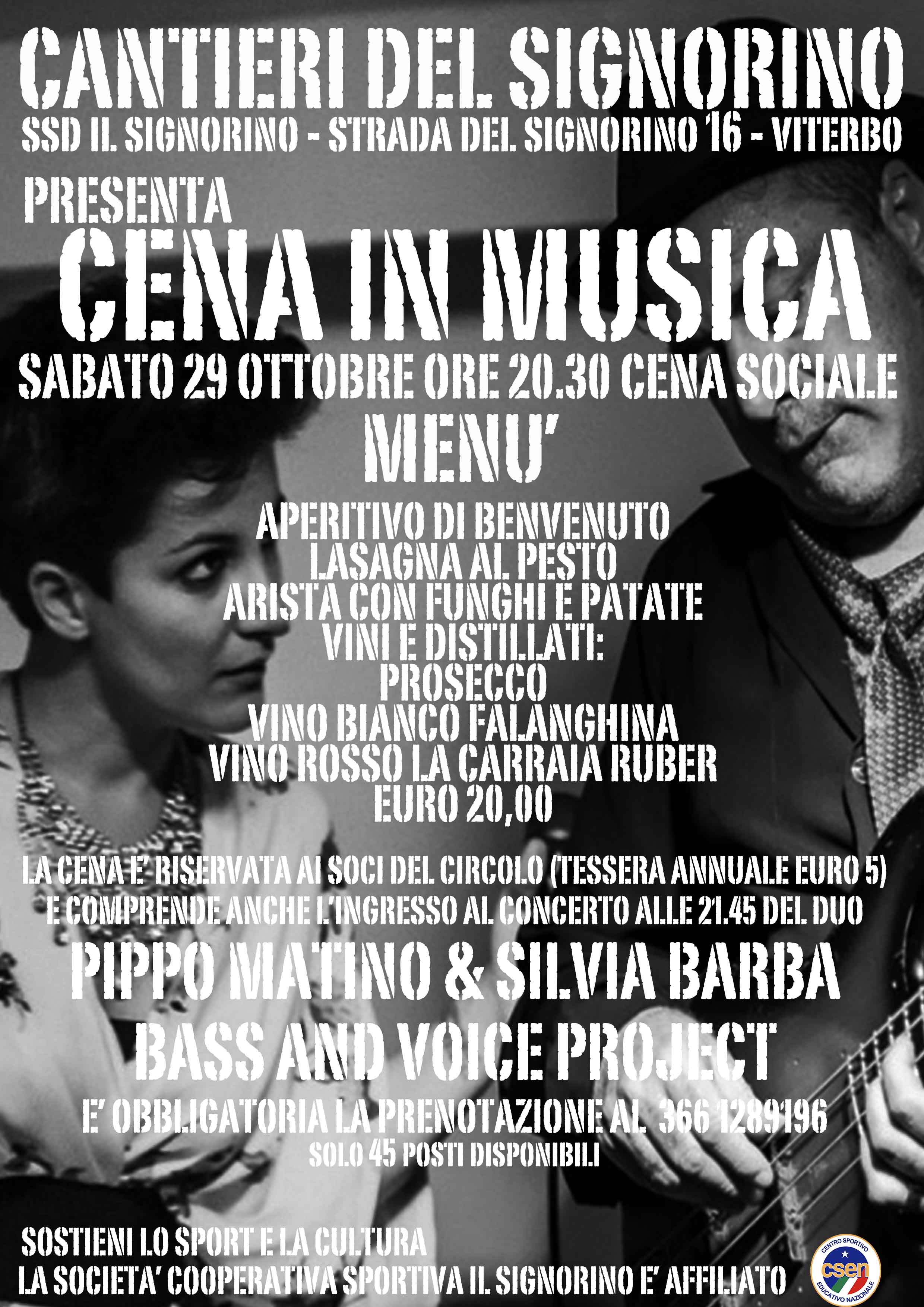 Da molti anni insieme, con due album all’attivo, Matino e Barba portano avanti un percorso che si snoda tra brani originali e la canzone d’autore rivisitata: un repertorio il loro che percorre un viaggio nelle sonorità mediterranee, nelle atmosfere melodiche e ritmiche, con particolare attenzione all’espressività dei testi scelti. Pippo Matino, musicista poliedrico che spazia dalla musica jazz e relative contaminazioni funky, blues, rock alla musica leggera italiana, è considerato tra i maggiori specialisti e virtuosi del basso elettrico in grado di costruire, nota dopo nota, le melodie di celebri brani italiani e internazionali. Silvia Barba, cantante romana e anche speaker radiofonica, è cresciuta artisticamente tra la Capitale e Parigi dove si è fatta apprezzare per l’energia della sua voce capace di giocare con i suoni e le emozioni. La serata come al solito sarà accompagnata da una cena sociale riservata ai soci del circolo. L’ingresso al concerto, che ricordiamo è riservato ai soci del circolo e la cui tessera costa 5 euro all’anno, sarà di euro 8 con consumazione. Il costo della cena e del concerto sarà invece di euro 20. Con solo 12 euro di differenza i soci potranno cenare al circolo ed assistere comodamente al concerto. Finito ottobre i Cantieri del Signorino presentano il programma delle attività di novembre.