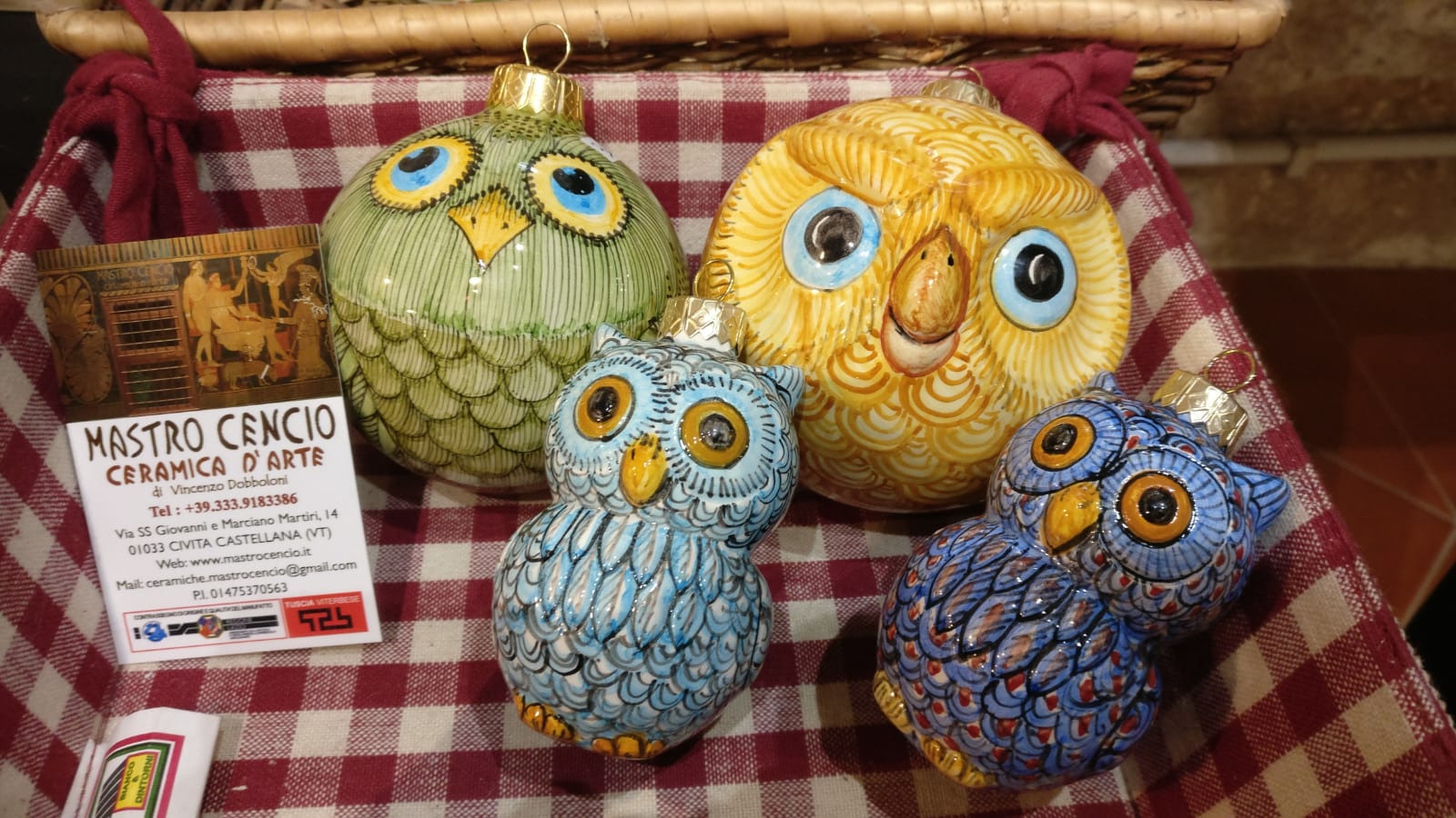 A Civita Castellana, il maestro ceramista Vincenzo Dobboloni ha realizzato per questo Natale splendidi gufi e civette in ceramica utilizzando la tipica tecnica di decorazione civitonica a ticchiolo. La scelta di questi soggetti (gufi e civette) deriva dall’ampio interesse e dalla richiesta da parte della clientela per questi curiosi animali. E per regali ancora più esclusivi, immancabile la riproduzione di vasellame falisco a figure rosse.