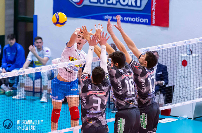 Quarto set: si parte punto a punto, 5 pari. Attacco di Marinelli murato, Passaro chiama il time-out 5/8. Ace di Casaro 5/9. Nel Tuscania Quagliozzi per Boswinkel. Ancora Ace Casaro 5/10 e ancora time-out chiesto da Tuscania. Marinelli trova il mani out del muro 9/12. Cappio fuori misura, 11/13. Muro di Casaro su Stamegna 12/16. Che si rifà subito 13/16. Muro di Menichetti su Casaro 15/17, Darraidou ferma il tempo. Marinelli chiude un’azione prolungata 16/17. Murato il primo tempo di Menichetti 16/19. Marinelli trova il mani out del muro 19/21. Attacco vincente di Stamegna 21/23. Ancora pipe di Marinelli, 22/24, Lecce ferma il tempo. Attacco vincente di Marinelli 23/24. L’attacco di Casaro chiude set e assegna la vittoria agli ospiti 23/25.