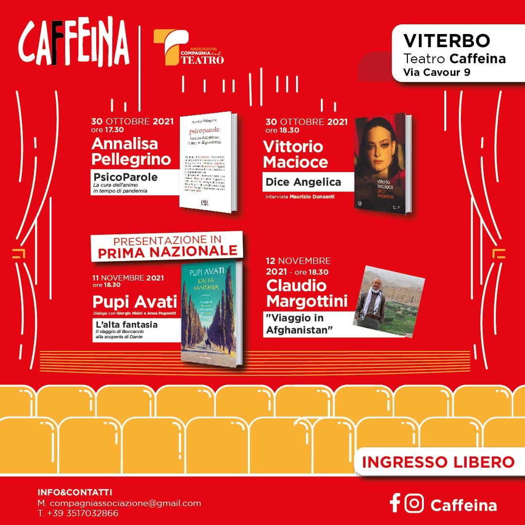 Chiude il quartetto un ospite di onore: il viterbese Claudio Margottini, geologo, attaché scientifico presso l’ambasciata italiana in Egitto, ci racconta il suo “Viaggio in Afghanistan” il prossimo 12 novembre alle 18.30. Arrivato al Cairo nel 2016, dal 2002 al 2013 Margottini ha lavorato in prima persona nel paese dei Taliban, occupandosi del restauro di importanti opere culturali. Il suo occhio vigile, attento e competente ci aiuterà a raccontare quel che sta accadendo in centro Asia, affrontandolo da una prospettiva diversa e intrigante: quella di un addetto scientifico che ha potuto contribuire alla conservazione dei beni di pregio culturale e ha potuto lavorare sullo sviluppo industriale di una regione martoriata da conflitti. Ancora grandi ospiti a Viterbo dunque, mentre senza sosta continuano gli allestimenti e le preparazioni per la stagione teatrale 2021-2022 del Teatro Caffeina: con lo sblocco delle sale teatrali al 100% torneranno a Viterbo i consueti grandi nomi della prosa nazionale.