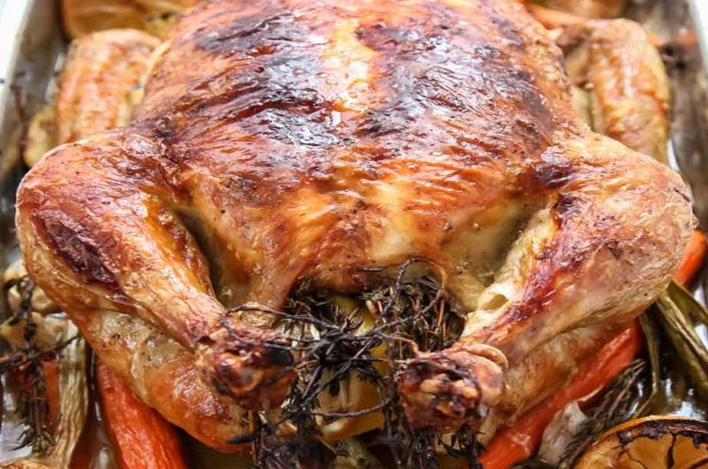 Impastate il burro con le erbe tritate, il sale e il pepe. Mettetene da parte un cucchiaio e inserite il resto fra la pelle e la carne, massaggiando con cura affinché si sparga bene. Procedete ungendo la parte esterna con il burro rimasto e l’olio. Inserite nella cavità addominale l’arancia steccata con qualche chiodo di garofano e legate le zampe. Appoggiate il pollo in una pirofila oleata e intorno disponete l’aglio intero, la cipolla e le carote a pezzi grandi e il limone tagliato a metà. Va in forno già caldo a 180 gradi e cuoce un’ora, un’ora e mezza a seconda della grandezza del pollo.