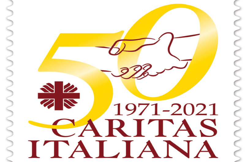 La vignetta riproduce il logo del 50° anniversario della fondazione Caritas Italiana in cui sono presenti la croce a raggiera, particolare tratto dal marchio della Caritas Italiana, il “50” a indicare gli anni trascorsi dalla fondazione dell’organismo pastorale, due mani che si stringono, emblema di solidarietà, gli anni “1971-2021” e la scritta “CARITAS ITALIANA”.