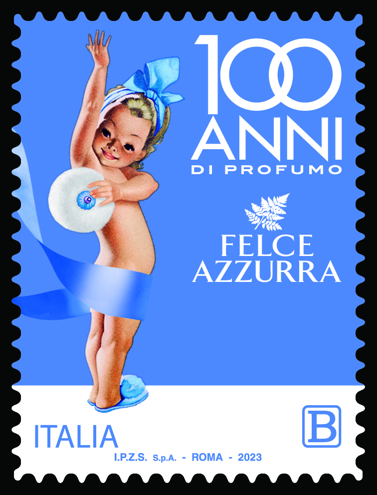 La vignetta riproduce l’iconica bambna del talco Felce Azzurra, protagosnista dei manifesti pubbliciatari degli anni 50’, opera dell’artista italiano Gino Boccasile e reinterpretata in occasione dei 100 anni del celebre marchio italiano che viene riportato sulla destra.
