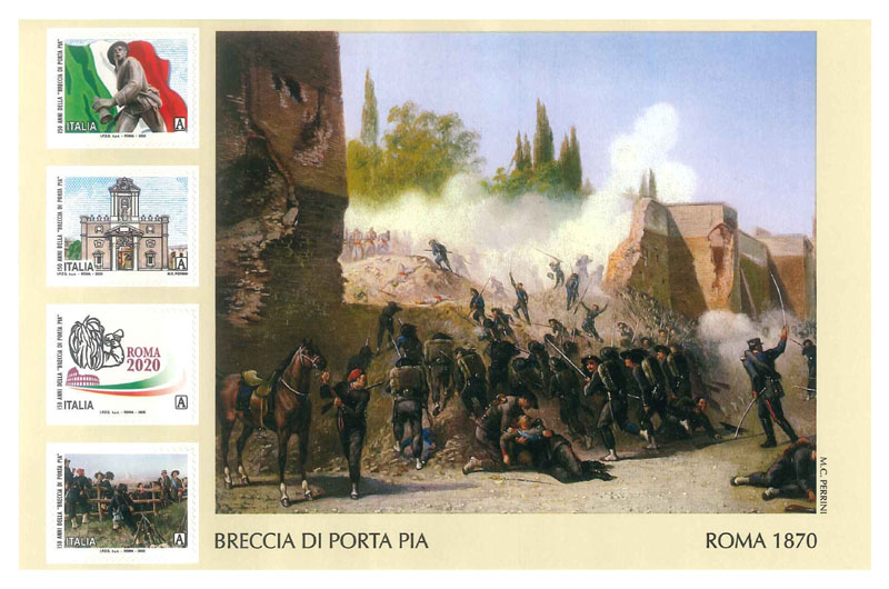 Poste Italiane comunica che il 20 settembre 2020 sono stati emessi dal Ministero dello Sviluppo Economico quattro francobolli racchiusi in un foglietto, celebrativi della Breccia di Porta Pia, nel 150° anniversario, relativi al valore della tariffa A pari a 2,80€.