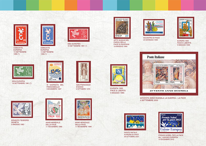 La collezione in formato A4 a due ante contiene 1 foglietto e 15 francobolli, tra cui quelli celebrativi “Anno Mondiale della Pace” (11 novembre 1986), “Europa 1995 – Pace e Libertà” (5 maggio 1995) e del conferimento del premio Nobel per la pace all’Unione Europea (10 dicembre 2012).
