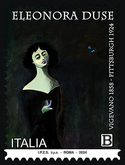 Completano il francobollo le legende “ELEONORA DUSE”, “VIGEVANO 1858” e “PITTSBURGH 1924”, la scritta “ITALIA” e l’indicazione tariffaria “B”.