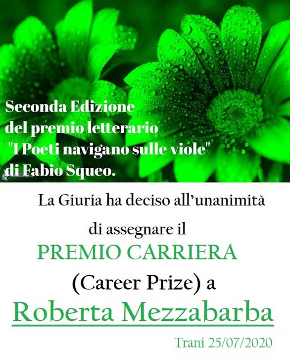 Seconda edizione del premio letterario internazionale on line “I poeti navigano sulle viole”-Fabio Squeo, il 25 luglio scorso a Trani la giuria ha assegnato il Premio alla Carriera alla scrittrice viterbese Roberta Mezzabarba.